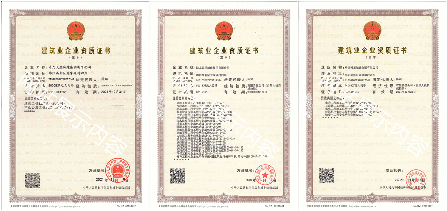浩龍?zhí)煨浅墙瘓F(tuán)有限公司,2007年成立于“李白故鄉(xiāng)、中國科技城”—四川省綿陽市,企業(yè)注冊資本金5.0008億元。公司共有27項(xiàng)建筑業(yè)企業(yè)資質(zhì),其中國家一級資質(zhì)11項(xiàng),二級資質(zhì)10項(xiàng),三級資質(zhì)5項(xiàng),特種資質(zhì)不分等級1項(xiàng),類別涵蓋建筑、市政、水利、機(jī)電、隧道、起重設(shè)備安裝等基礎(chǔ)及未來發(fā)展重點(diǎn)專業(yè)。公司下設(shè)三個(gè)辦事處,業(yè)務(wù)范圍輻射全國,在建項(xiàng)目三十余個(gè),累計(jì)完成產(chǎn)值超11億元。公司是綿陽市建筑施工企業(yè)協(xié)會副會長單位、綿陽遂寧商會會長級單位、綿陽首批建筑業(yè)綠卡企業(yè),在綿陽本地企業(yè)中綜合實(shí)力名列前茅。